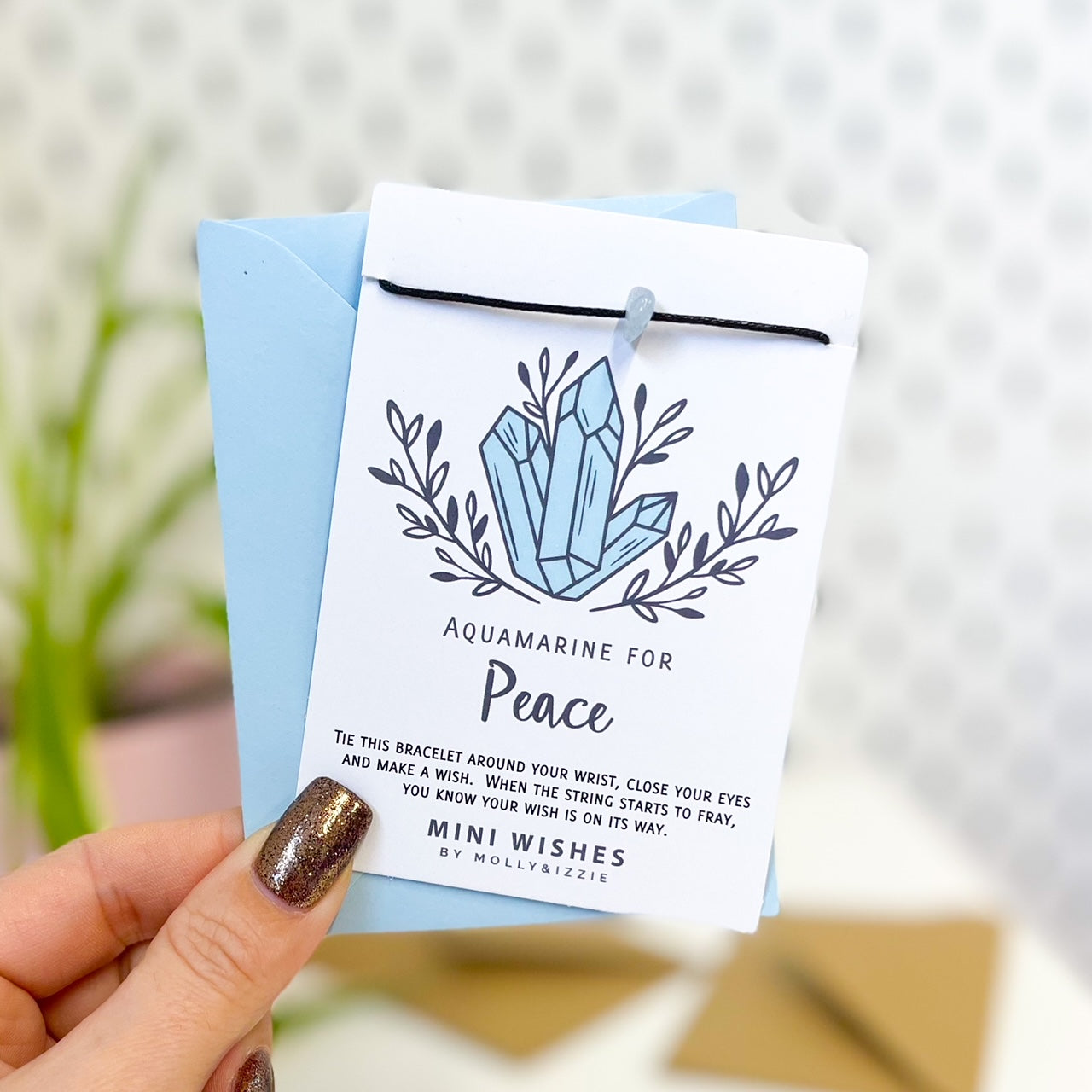 Little Wishes cords are 35mm in length and untied, so they will fit any size of wrist. Simply remove the cord from the card and tie to secure in place, then cut off the ends. They are presented on an smooth 350gsm A7 card in a clear cellophane pouch and each come with a little matching envelope.
